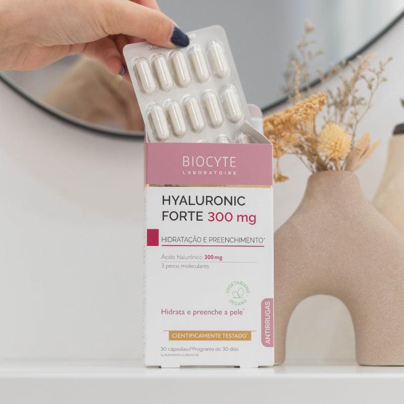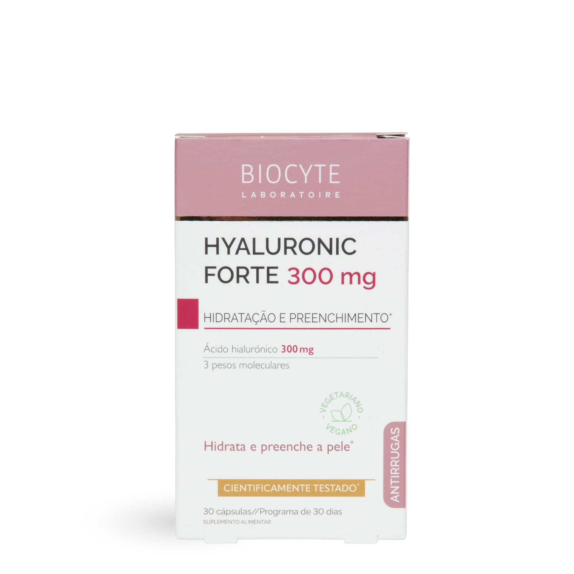 BIOCYTE HYALURONIC FORTE 300mg é um suplemento à base de ácido hialurónico de diferentes pesos moleculares, que hidrata a pele e melhora a sua elasticidade.