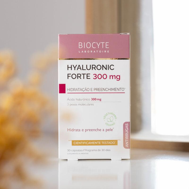 BIOCYTE HYALURONIC FORTE 300mg é um suplemento à base de ácido hialurónico de diferentes pesos moleculares, que hidrata a pele e melhora a sua elasticidade.