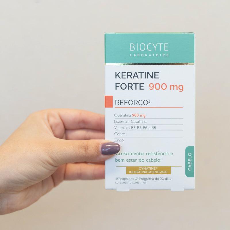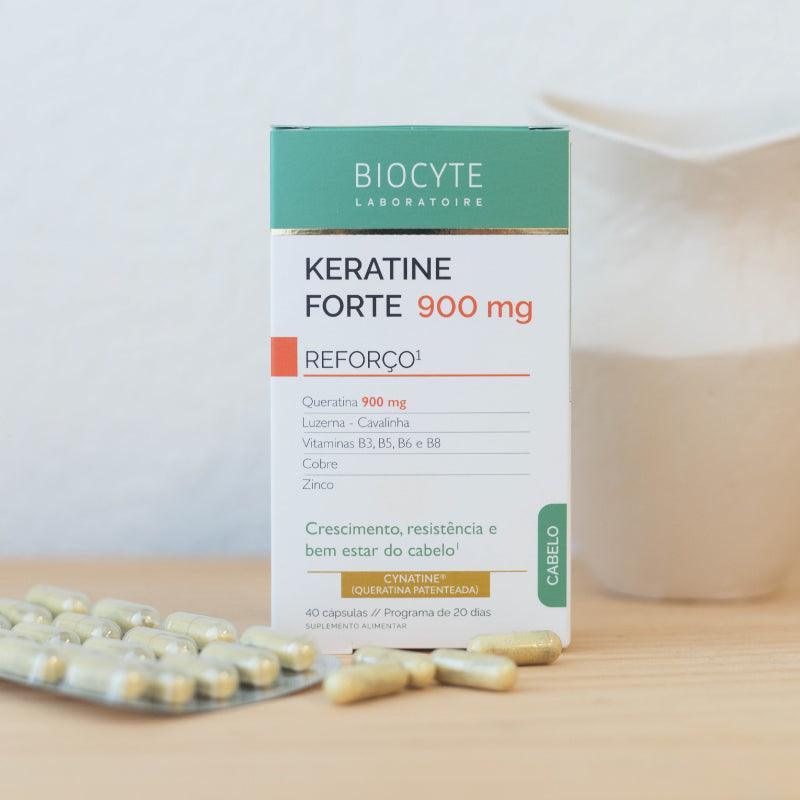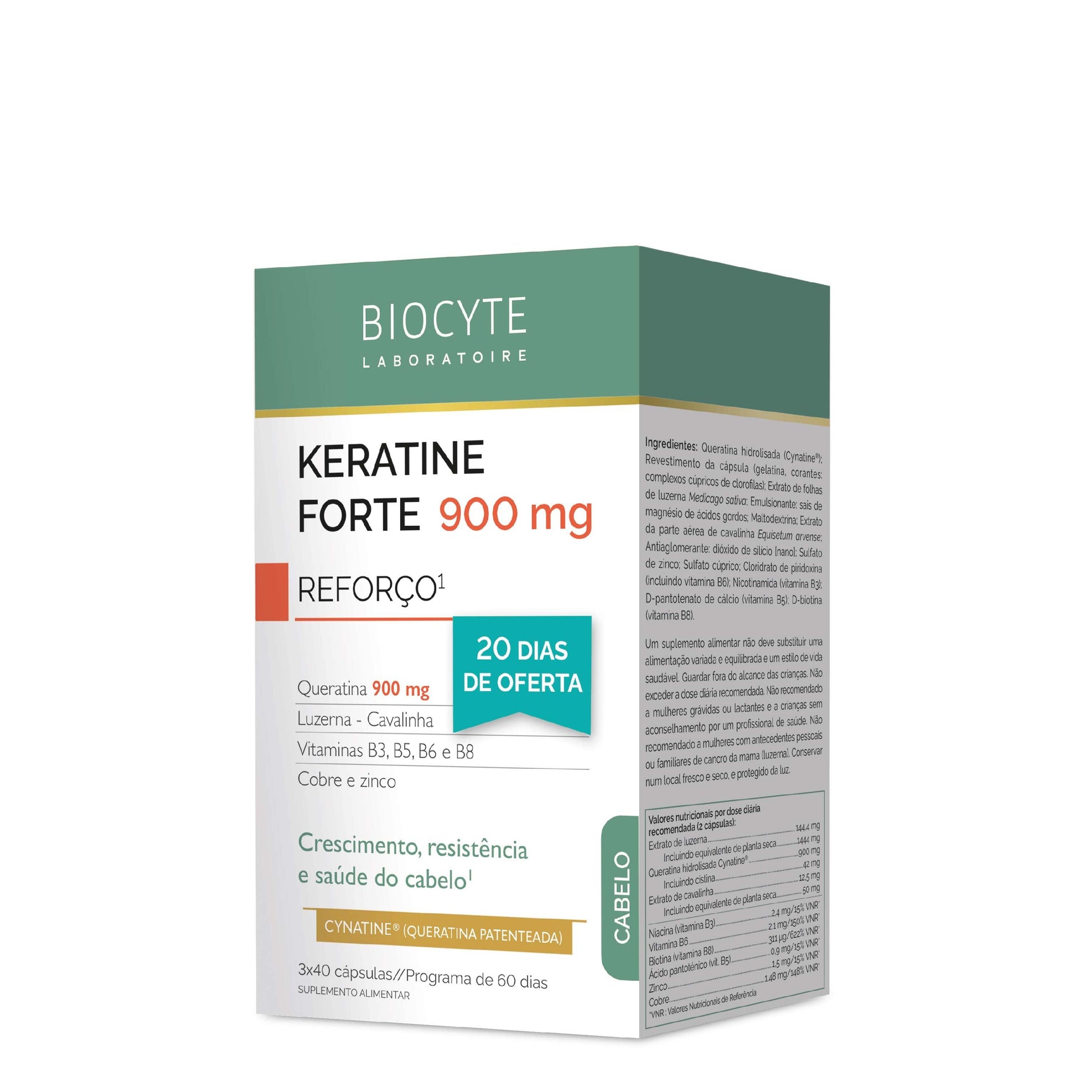 BIOCYTE KERATINE FORTE 900MG é suplemento com uma fórmula única que combina o complexo patenteado K-Amine+TM, Cavalinha e Alfafa que estimulam o crescimento do cabelo, vitaminas e minerais.