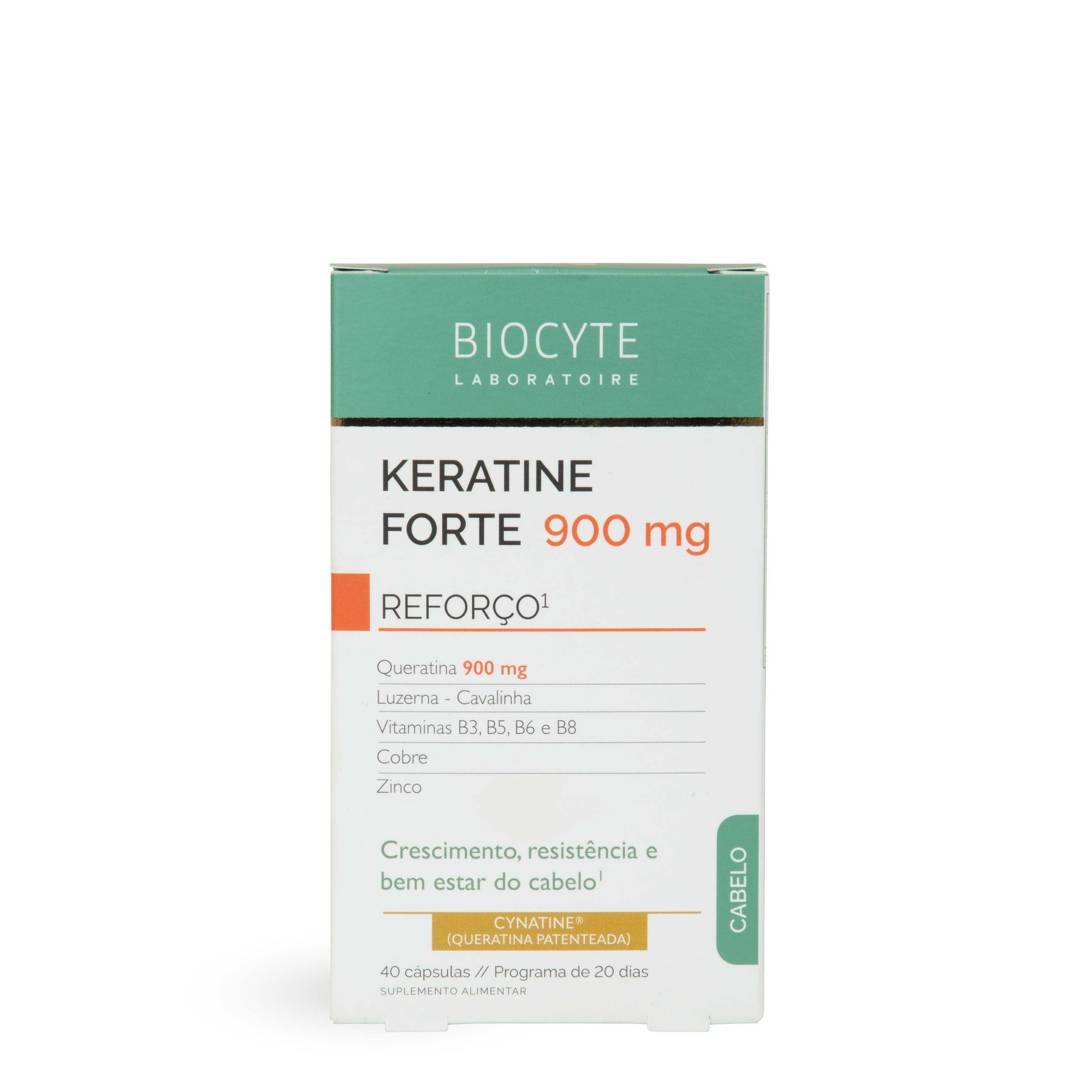 BIOCYTE KERATINE FORTE 900MG é suplemento com uma fórmula única que combina o complexo patenteado K-Amine+TM, Cavalinha e Alfafa que estimulam o crescimento do cabelo, vitaminas e minerais.