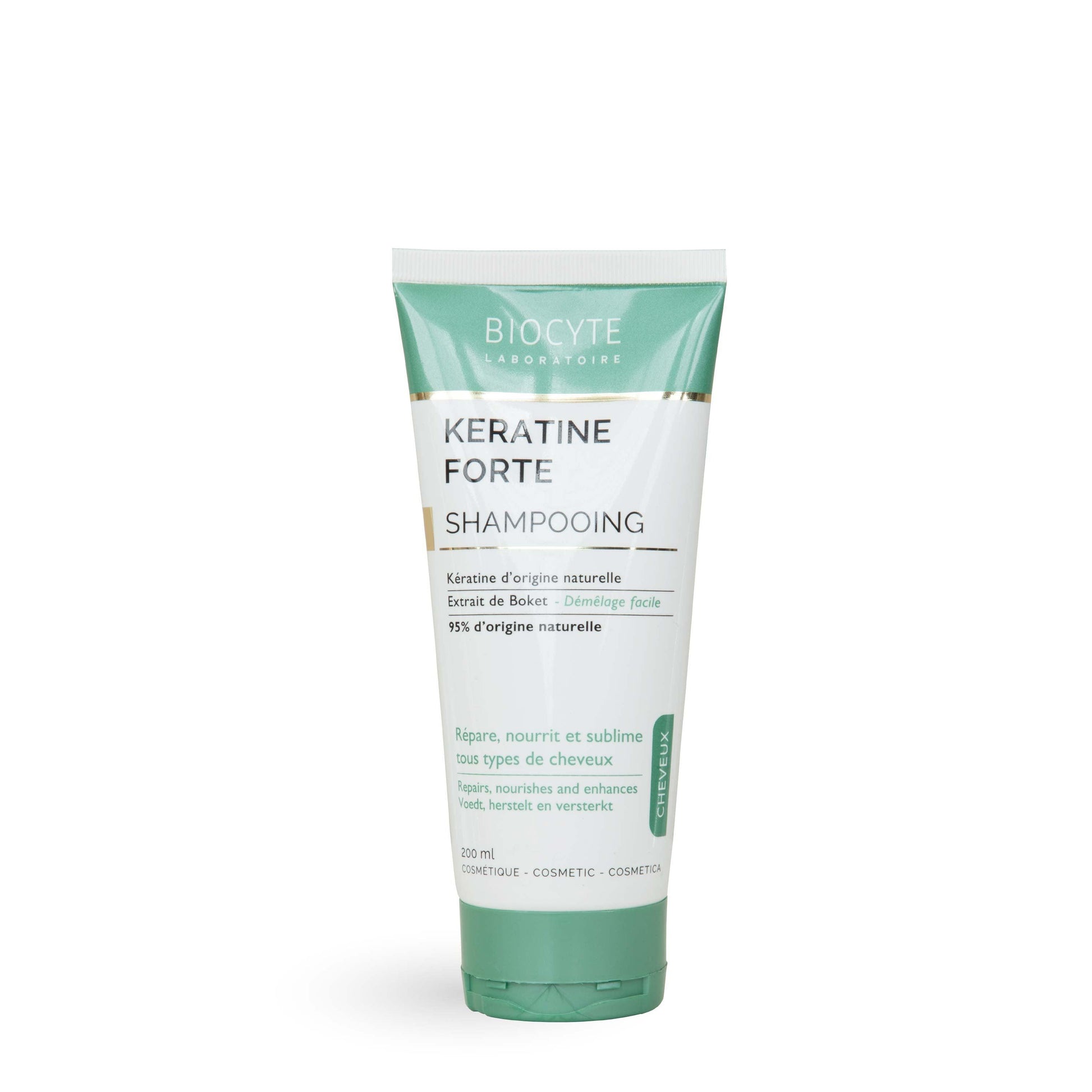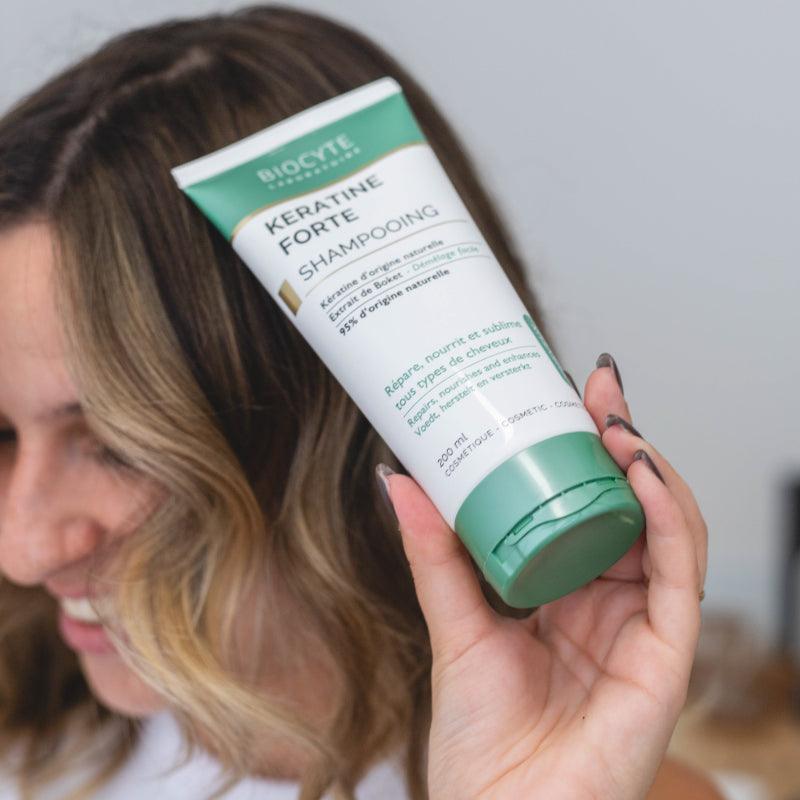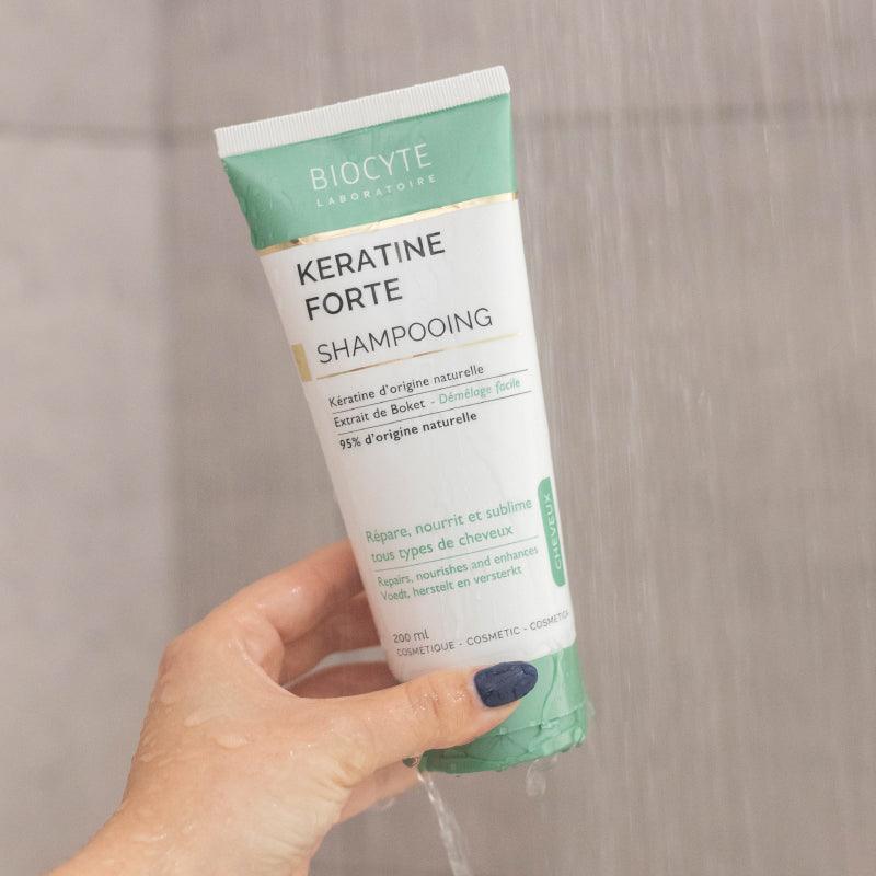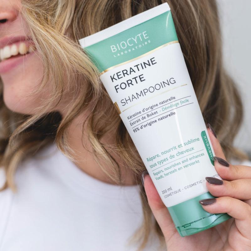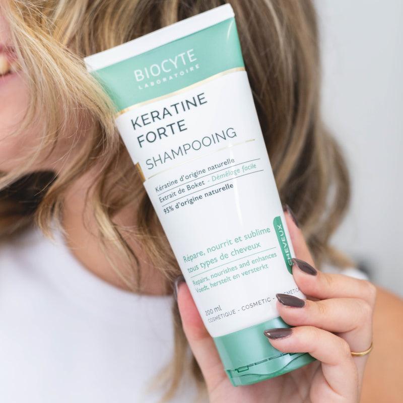 BIOCYTE KERATINE FORTE CHAMPÔ de origem vegetal repara, nutre e fornece volume e brilho graças ao extrato de boket, planta vietnamita e à queratina.