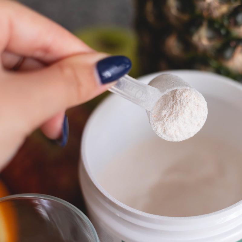 Suplemento alimentar à base de proteínas, aminoácidos, extratos vegetais, vitaminas e minerais, com adoçante.